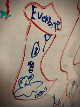 “We all do!” The other night, volunteers from my church prepared the Fellowship Hall and classrooms for our eight expected guests. Each winter, on Monday nights, those spaces become temporary hotel rooms and a dining hall for our unhoused neighbors. While the adults busily prepared chili and baked potatoes, the kids made up the beds and set places at tables for the dinner. I decorated the white board with colored markers, drawing an Advent wreath, a mantle, a fireplace, and four stockings. I went over with colored markers and asked the four kids who wanted to decorate a stocking. Resoundingly, they bounced up and down and chorused, “We all do!”